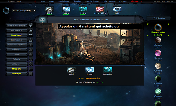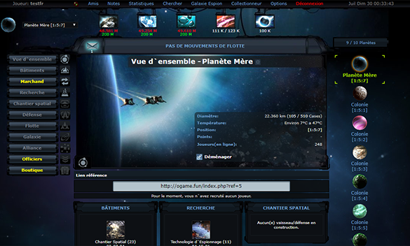 OGame est un jeu de stratégie dans l'espace. Des milliers de joueurs s'affrontent sans arrêt sur nos serveurs. Pour jouer, il vous suffit d'avoir un navigateur Internet.